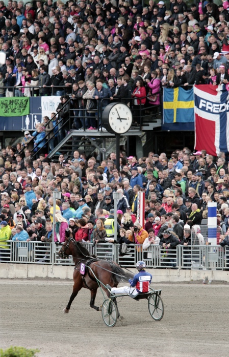 Jennifer i blå/röd/vit dress på Elitloppet 2015. Foto Lars Jakobsson/TR media.